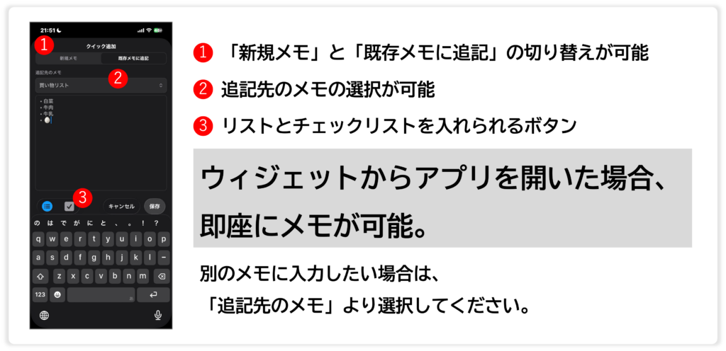 ホーム画面・コントロールパネル・ロック画面へウィジェットを配置して、それぞれをタップした場合、アプリが起動してすぐにメモすることができる「クイック追加」のウィンドウが開きます。