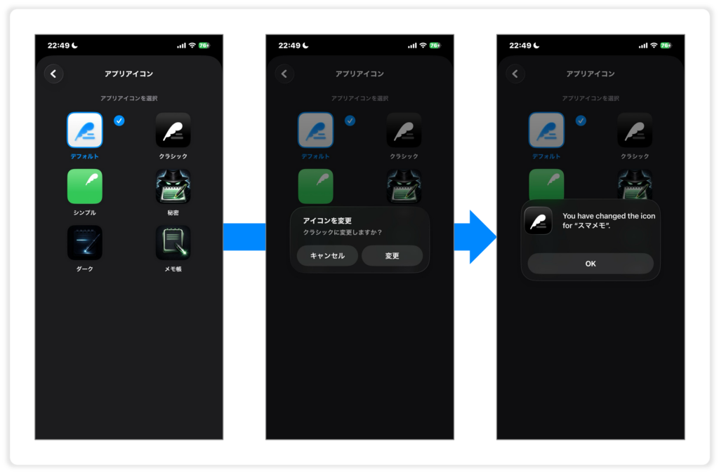 【スマメモ】アプリアイコンの設定 2026 2/01 使い方 2026年1月24日2026年2月1日 スマメモでは、アプリアイコンの変更ができます。お好みのアプリアイコンにご設定ください。*プレミアム限定機能です。 まだダウンロードされていない方は下記からご利用ください。 目次アプリアイコンの変更方法 Step1 : アプリのメニューから「アプリアイコン設定」を選択Step2 : お好みのアイコンを選択Step3 : 「変更」をタップStep4 : 完了 まだダウンロードされていない方は下記からご利用ください。 使い方 SNSでご紹介いただけると嬉しいです URLをコピーしました! URLをコピーしました! 【スマメモ】バックアップと復元 関連記事関連する記事はまだ見つかりませんでした。